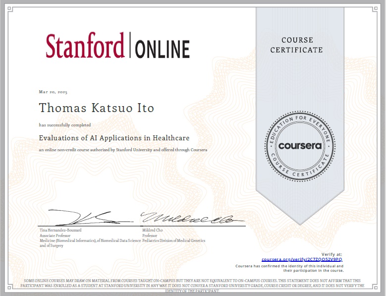 Curso Evaluations of AI Applications in Healthcare ministrado pela Universidade de Stanford pela Coursera em 2025.